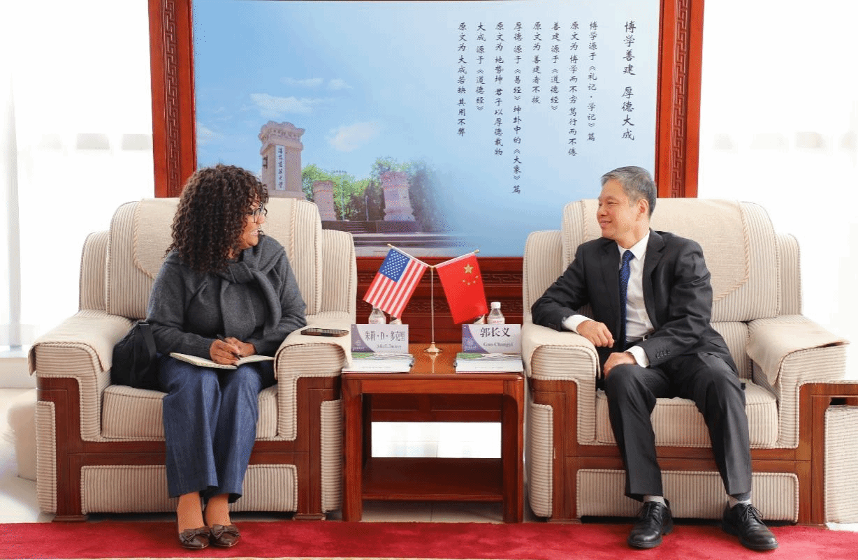 郭长义代表学校对朱莉一行的到来表示欢迎。他指出,我校与班尼迪克大学合办的信息管理硕士项目自2004年获得国务院学位委员会批准以来,已走过20年的办学之路,双方在项目管理、教学实施等方面积累了丰富经验,培养了大量的政府、企业、高校等优秀人才,为我国计算机及管理领域的发展作出了重要贡献,感谢朱莉多年来对该项目的持续支持,使两校之间的合作融洽且紧密。同时,他提及班尼迪克大学坐落的芝加哥是美国最重要的文化科教中心之一,回顾了自己在芝加哥访学时的经历,感叹时代已发生改变,但教育是连接中美文化、经济的桥梁,对两国而言,深化教育领域的合作,不仅有助于提升彼此的国际竞争力,更能促进两国关系的发展。他希望,两校之间未来能够在合作办学、师生互访、科学研究等方面进一步深度合作。