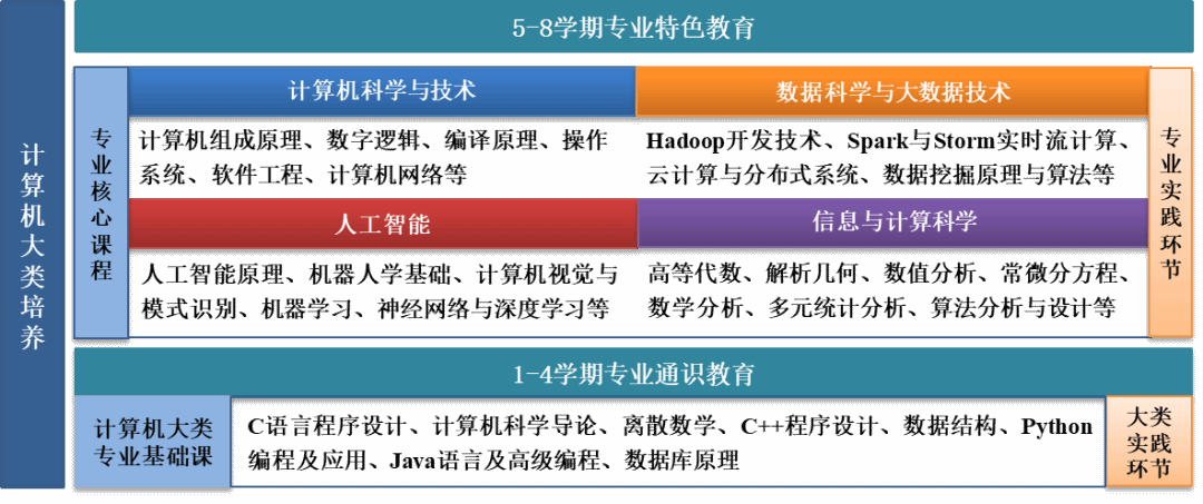 学院坚持以学生为中心,为学生营造能够充分发挥潜能的育人环境,实施计算机大类人才培养,打破计算机科学与技术、人工智能、数据科学与大数据技术、信息与计算科学等四个本科专业壁垒,在1-4学期开展计算机专业通识教育,夯实学生计算机学科专业基础知识及实践能力;在5-8学期开展专业特色教育,通过开设各专业核心课程和综合性实践环节,形成学生的专业核心素养。加入辽宁省计算机类实践教学虚拟教研室平台,构建计算机学科基础课程和专业核心课程组,培育一流课程和教学团队。
