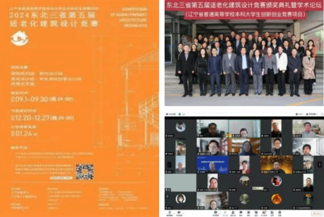 举办辽宁省普通高等学校本科大学生创新创业竞赛项目,为东北地区搭建适老化设计人才培养与学术交流平台。由辽宁省教育厅、辽宁省土木建筑学会、辽宁省老龄产业协会主办,辽宁省养老建筑工程与服务产业校企联盟、大连理工大学协办,沈阳建筑大学承办的东北三省适老化建筑设计竞赛(辽宁省普通高等学校本科大学生创新创业竞赛项目),主要分为建筑规划组、室内设计组、景观设计组、老年游戏创意设计组与优秀论文组五类。目前已经连续举办五届,得到政府、社会及全国相关领域各高校的广泛关注与参与,竞赛的选题采取政府、企业、高校、科研院所等共同参与的方式,评选作品为企业和政府提供了新的思路和建议,实现了获奖方案的实际应用价值。