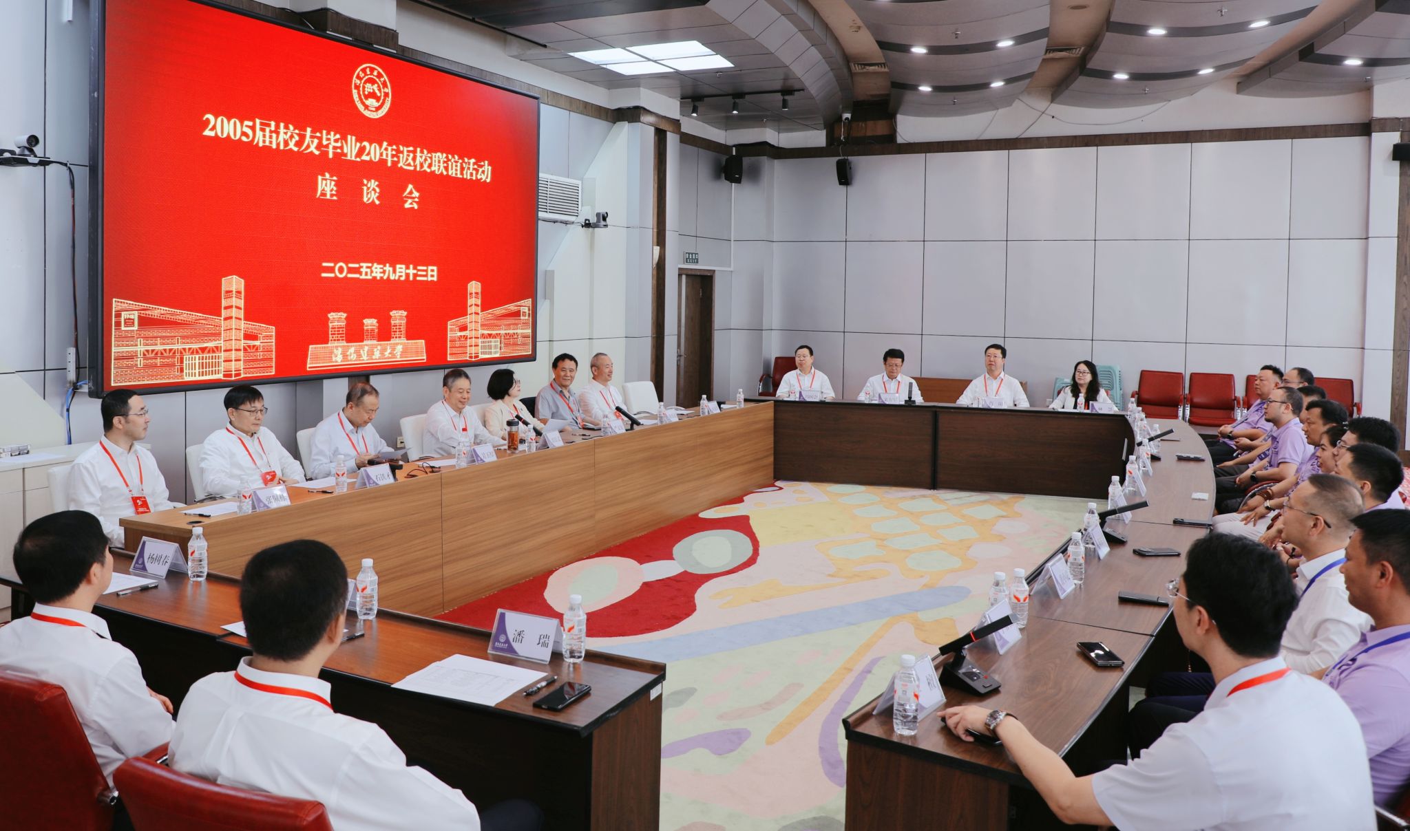 会前,校领导、老领导与麻岩、邢笑怡、梁贤昱等2005届校友代表召开座谈会。校友们向母校汇报了自己毕业20年的发展情况,表达了对母校培养的感恩之情。校党委书记郭长义代表学校向2005届校友们致以最热烈的欢迎,对大家毕业二十载后集体返校的深情之举表示由衷感谢。他表示,这份跨越二十年的返校之约,既是对母校培育的深切认可,更饱含着校友们对母校的赤子深情,让学校备受感动。他强调,建大是一所有着深厚红色基因传承的学校,孕育了特色鲜明的校园十大文化,能与大家同为“建大人”感到骄傲与自豪。他充分肯定了校友们为国家建设和社会发展作出的贡献,希望未来校友们继续秉持“博学善建、厚德大成”的校训精神,不断求索、开拓进取,凝心聚力为母校发展绘新图、谱新篇。