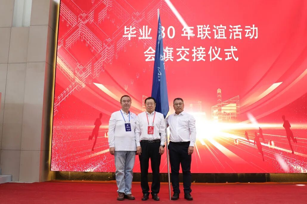 会上,举行了校友毕业30年联谊活动会旗交接仪式。党委常委、副校长王凤池将会旗交到96届校友代表手中。