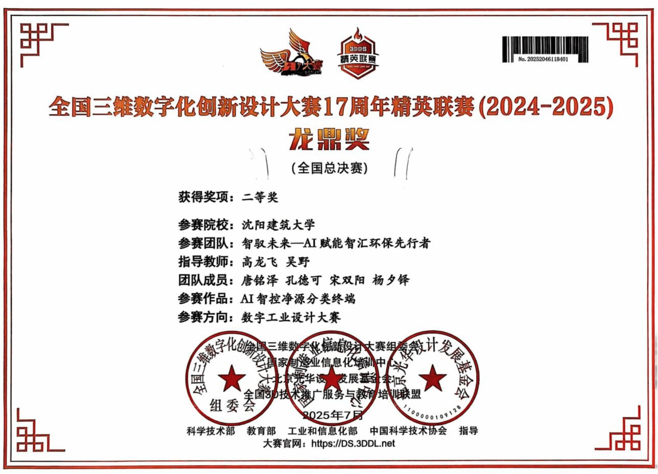 近日,全国三维数字化创新设计大赛(17周年精英联赛)2024-2025年度总决赛落幕,由我校工创学院教师高龙飞、吴野指导的学生团队项目《AI智控净源分类终端》,凭借出色的创意设计、精湛的3D数字技术与工程实践能力,在激烈的竞争中脱颖而出,最终斩获全国总决赛二等奖。