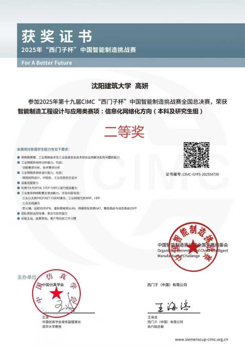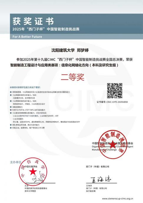 近日,2025年第十九届“西门子杯”中国智能制造挑战赛(CIMC)全国总决赛在太原理工大学落下帷幕。我校电气与控制工程学院通信工程2023级学生高妍、郑梦婷经过初赛激烈的角逐,在智能制造工程设计与应用类赛项:信息化网络化方向初赛中获得省特等奖,并顺利进入全国总决赛,最终荣获国家二等奖。