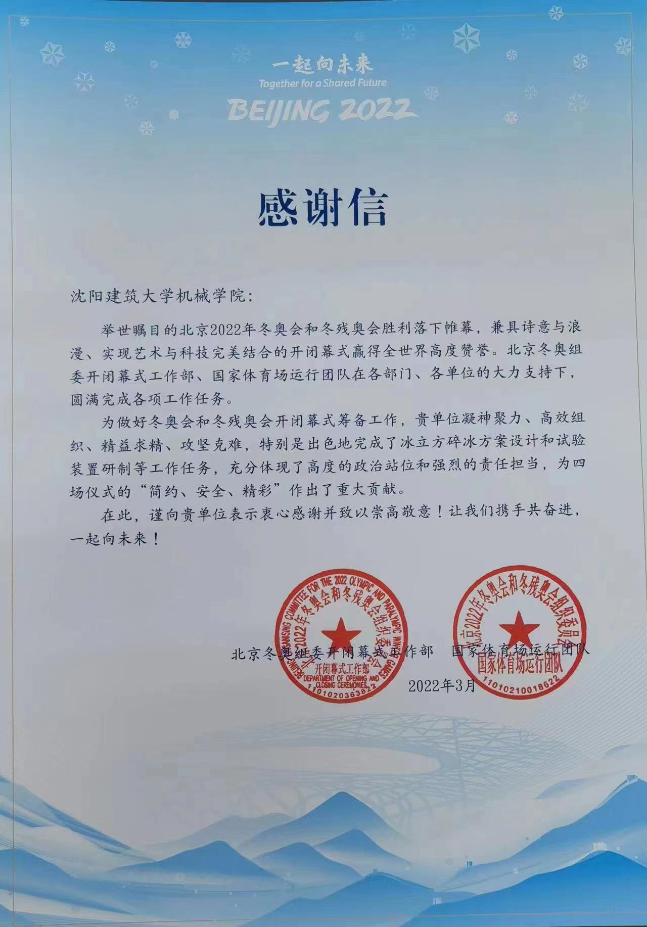 近日,北京2022年冬奥会和冬残奥会组织委员会向我校发来感谢信,对我校机械学院雷东亮教师研究团队承担的冬奥会和冬残奥会中的冰立方(含五环)碎冰方案设计及冰立方(含五环)碎冰试验装置研制等工作给予高度肯定和认可。