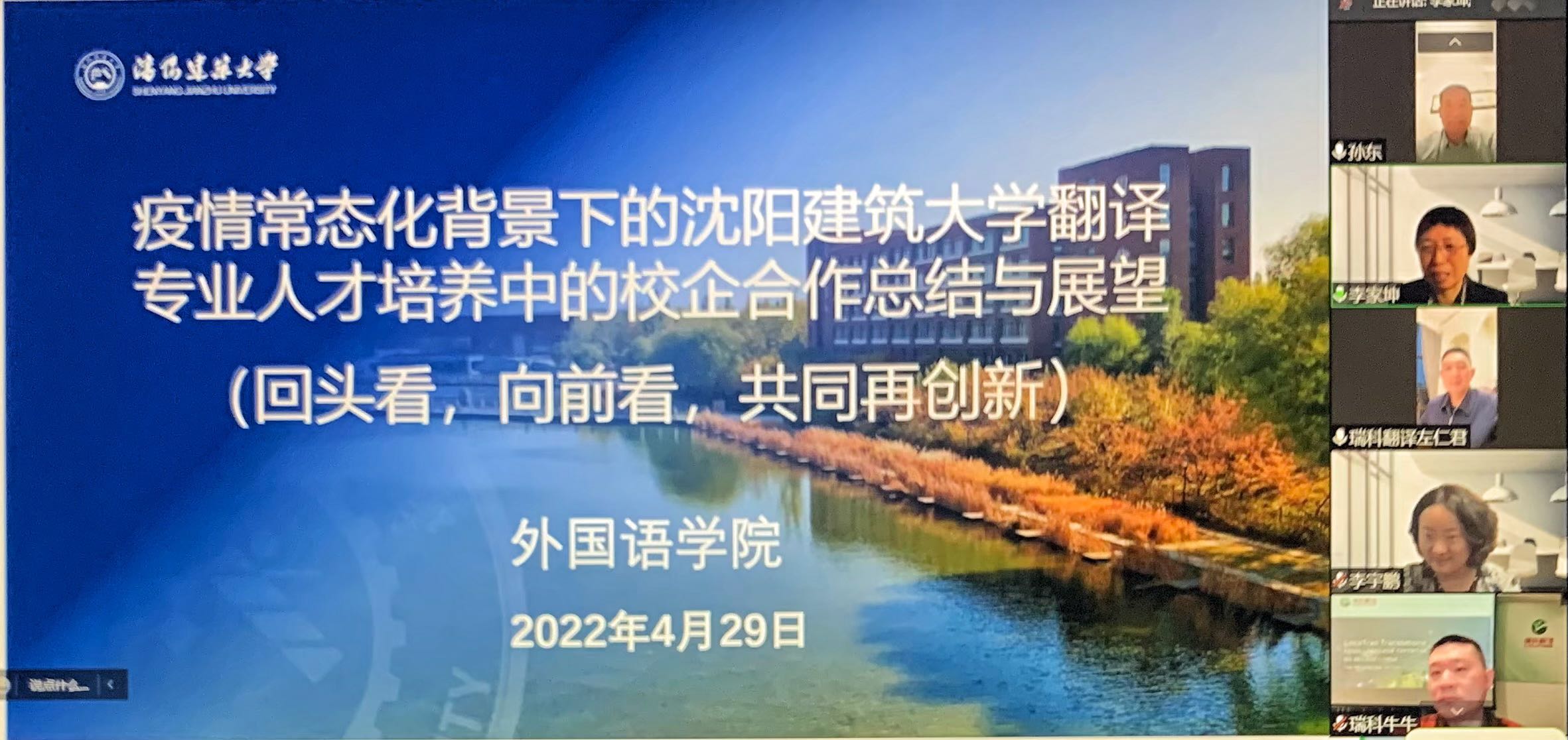 会上,学院回顾了与瑞科翻译有限公司签署共建翻译人才联合培养基地的过程,总结了疫情常态化背景下翻译专业人才培养中的校企合作。左仁君和刘克超就共建校企合作提出了公司的顶岗实习培养、先能力后实习和整理能力培养清单的人才培养模式。