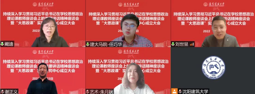 张晓雁主持会议并介绍了《沈阳建筑大学“大思政课”实践研究中心建设方案》,潘瑞代表马克思主义学院总结回顾近三年学校思政课建设的主要进展和成效,思政课教师代表马克思主义学院阚迪、任巧华、刘世昱,专业课教师代表机械工程学院谢正义,辅导员代表艺术学院学办主任朱月秋进行了交流发言。