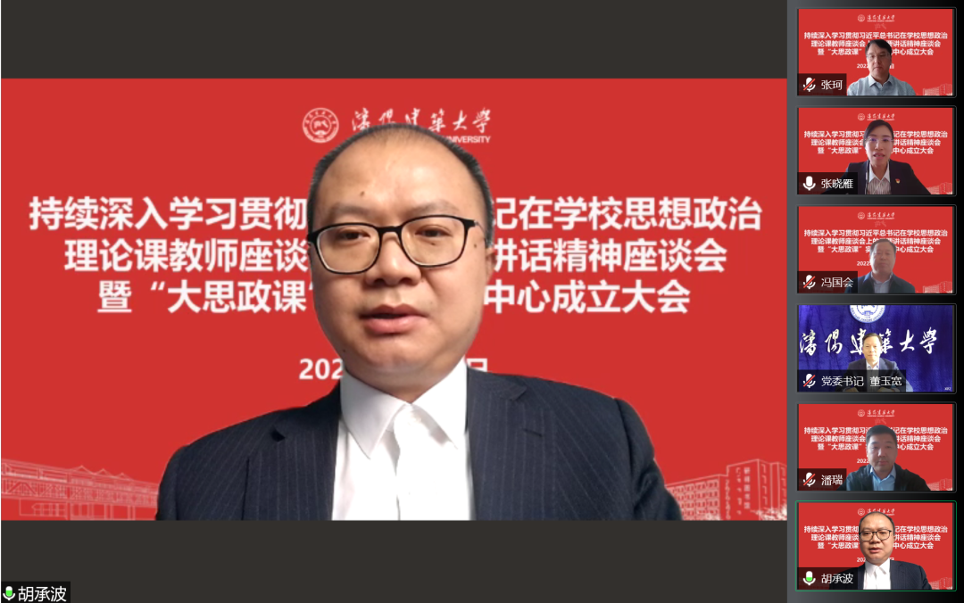 3月23日下午,学校以视频会议形式召开持续深入学习贯彻习近平总书记在学校思想政治理论课教师座谈会上的重要讲话精神座谈会暨“大思政课”实践研究中心成立大会,学校党委书记董玉宽,党委常委、副校长冯国会、张珂,党委常委、宣传部部长张晓雁,党委常委、组织部部长潘瑞出席会议,相关部门负责人、马克思主义学院领导班子成员、全体思政课教师,专业课教师、辅导员代表参加会议。省委教育工委宣传部部长胡承波应邀出席。