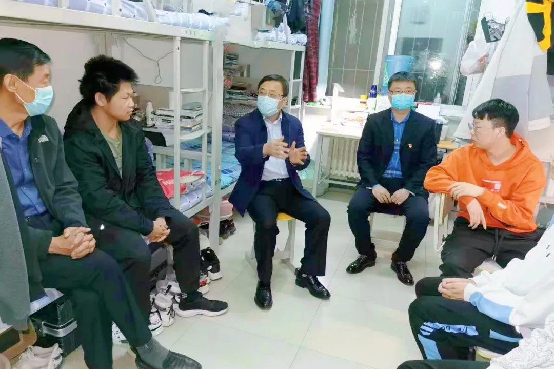 董玉宽在和学生交流中指出,习近平总书记在庆祝中国共产主义青年团成立100周年大会上的重要讲话,对青年学生寄予了殷切希望,提出了明确要求,充分体现了党对青年学生成长的关心关爱。当前仍然是疫情防控的关键时期,这场疫情防控阻击战是否能打赢、全校师生的生命健康安全是否能守护好,离不开同学们的理解支持和配合。他在走访过程中深情寄语同学们,要坚定抗疫“必胜心”,统一思想、坚定信心,严格遵守疫情防控各项规定,相信科学、理性应对,不信谣、不传谣,保持积极向上、自信乐观的心态,做舆论的正面引导者,传递疫情防控正能量;要守好个人“防护关”,坚持做好健康监测,积极配合核酸检测、体温测量,主动及时报告身心健康状况,坚持戴口罩、勤洗手、常通风,注意个人卫生,切实做好个人防护;要丰富知识“立大志”,刻苦学习、丰富自己,自觉在严峻的疫情防控实践中考验自己、锻炼自己、审视自己,做有理想、敢担当、能吃苦、肯奋斗的新时代好青年。