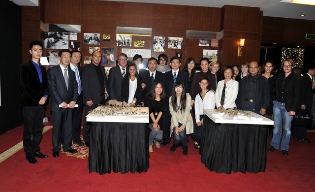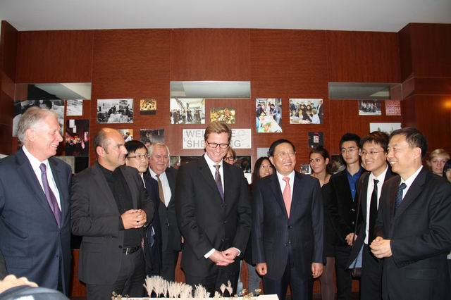 陈政高、吉多·韦斯特韦勒等中德政要饶有兴致的在项目模型前与中德师生合影。