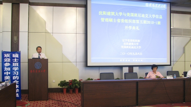9月8日下午,沈阳建筑大学与美国班尼迪克大学信息管理硕士省委组织部第五期2010-1班开学典礼在我校举行,我校党委书记张福昌、省委组织部干部教育处处长潘静华出席了开学典礼,并分别做了重要讲话。中美信息管理硕士2010-1班全体学员以及美国班尼迪克大学吕立行博士,阿拉斯加大学梅勒妮•伯蒂斯博士,我校组织部、人事处、国际交流处、信息学院等负责人参加了开学典礼。