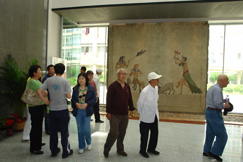 上午9时,社会各界人士陆续来到校园,在校友总会学生志愿者的引导下,通过中央水系的鹏程桥来到建筑博物馆。早已等在那里的学校领导和有关人员欢迎大家的到来。沈阳市政府的有关领导、中国新闻社辽宁分社等媒体的记者也来到参观现场。建筑面积4000多平方米的展厅的各个区域集聚了参观者,他们刚刚看完古希腊建筑介绍,又急着去看中国传统的典型建筑,从沈阳老建筑的“昔与今”到建国60年全国的300个获大奖建筑,从秦砖汉瓦到北京奥运会的“鸟巢”特种钢材,从东北电影院的老壁画,到铜铸的沈阳故宫大政殿、龙椅,参观者目不暇给。来自东北大学的一位老教授带着儿子、儿媳和孙子参观,老先生知识渊博,对展出的来自台湾故宫博物院全幅《清明上河图》等文物的相关知识非常了解,他的补充介绍,引起了大家的共鸣。86岁的耄耋老人于先生,身体硬朗,对沈阳的城市变迁感触颇深,对我校的建筑博物馆的创意和理念赞叹不已。
