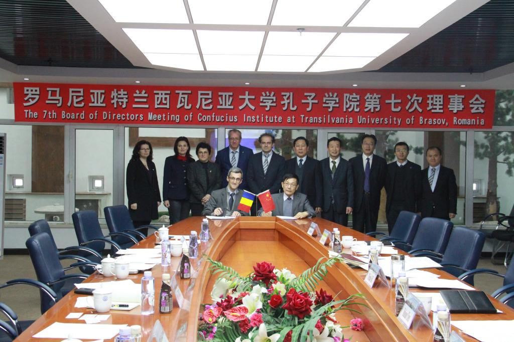 理事会上,两校孔子学院院长阿德里安·拉卡杜斯和杨兆宇就2016年孔子学院工作做工作汇报。石铁矛肯定了孔子学院教师及志愿者积极推动汉语教学及文化传播的工作成效,希望中罗两校教师继续致力孔子学院发展,不断拓展新的教学点以及增加学生人数,推动两校人文交流。陈瑞三就依托孔子学院开展两校科技合作以及联合举办国际会议等议题与罗方进行了交流。石铁矛与丹尼尔·蒙特亚努分别代表两校签署了《罗马尼亚特兰西瓦尼亚大学孔子学院第七次理事会备忘录》。