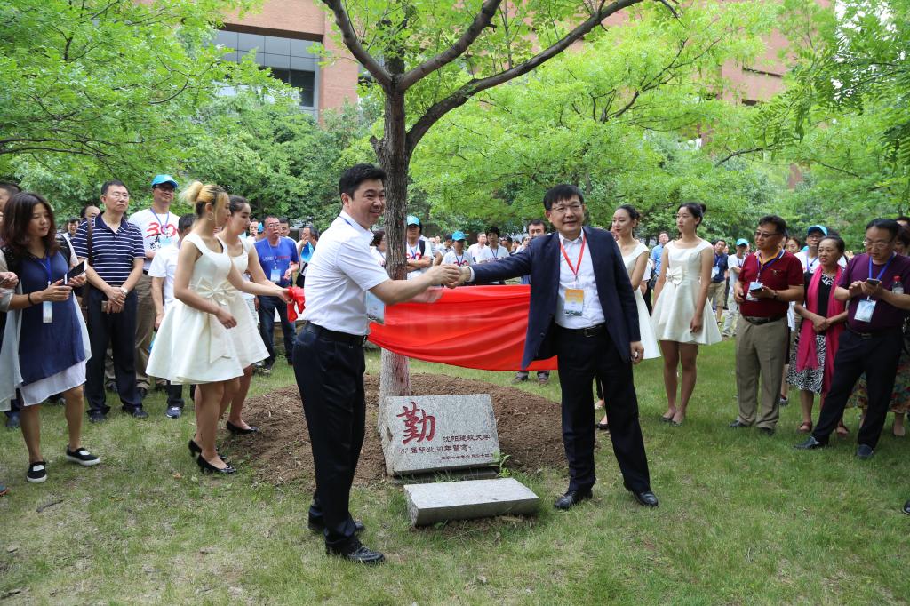9点30分,学校领导和校友们来到体育中心文体馆东四门广场,参加了87届校友毕业30年纪念树揭牌仪式。校友总会会长、校长石铁矛和工民建83-4班校友沈跃共同为纪念树揭牌。