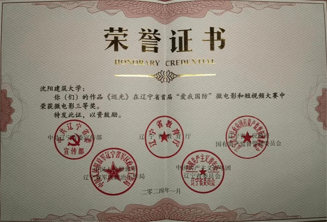 近日,由辽宁省委宣传部、辽宁省教育厅、辽宁省人民政府国有资产监督管理委员会、中国人民解放军辽宁省军区政治工作局、中国共产主义青年团辽宁省委员会共同承办的以“爱我国防”为主题的辽宁省首届微电影和短视频大赛结果揭晓,我校推荐报送的作品《巡光》获微电影三等奖。
