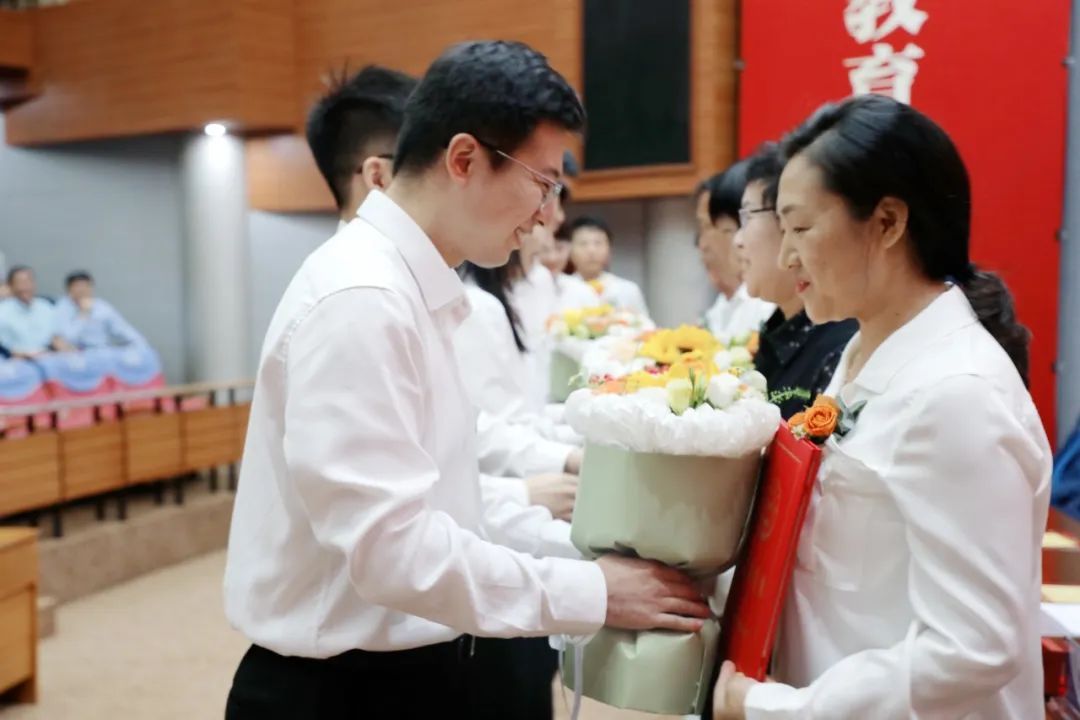 与会校领导为受表彰的教师代表颁发荣誉证书,并为新入职教师代表佩戴校徽。新教师代表为荣休教师代表献花致敬。全国教育系统先进工作者努尔麦麦提·吐尔孙、校优秀教师代表吴丽梅分别发言。