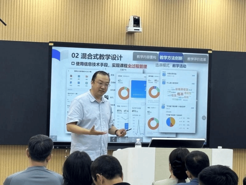 赵鲁涛围绕“AI赋能课程建设与教学创新”这一主题,从混合式课程建设标准、混合式课程建设探索与实践、AI+混合式课程建设三个方面展开。以《概率论与数理统计A》课程为例,介绍了该门课程混合式教学设计,授课形式从线上到线下,授课内容从基础到高阶递进;以立德树人为根本,探索“课程思政”新模式;注重经典基础理论知识和实际案例、前沿成果相结合,突出教学内容的与时俱进;与信息技术有机融合,提升知识理解与应用。以红包实验为指引,生动演示了理论到实践的有效升华;教学模式从刚性到柔性转变,满足学生个性化学习需求;该课程开展了深度研讨,突出学生学习主体地位;使用信息技术手段,实现课程全过程管理;打通课内、课外互补双渠道,持续推动知识与实际应用的紧密结合。加强多元评价,以持续反馈推动学习和教学效果不断提升。注重教学反馈,深入、细粒度试卷分析,形成教学质量闭环管理。在AI+混合式课程教学方面,以AI助课辅助案例生成、小测生成;AI助教助力智能答疑、资料推荐;AI助学实现路径规划、习题推荐;AI助评完成主观问题评价、学习数据解析等。同时介绍了当前知识图谱的形态以及未来共享图谱和专业图谱的建设方向,让学生主动地学、教师创造地教,AI+混合式教学成为“新常态”。