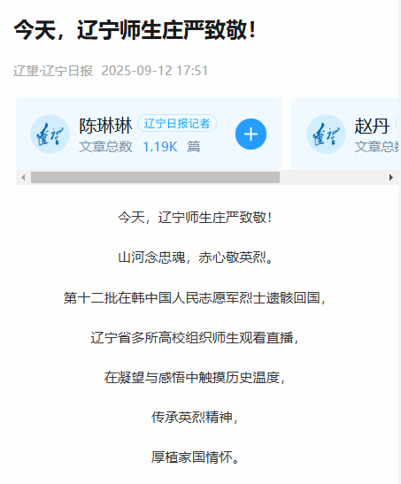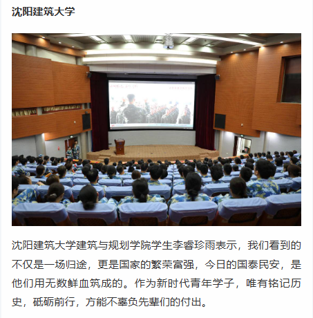 编者按:今天,第十二批在韩中国人民志愿军烈士遗骸回国,沈阳建筑大学组织师生观看直播,在凝望与感悟中触摸历史温度,传承英烈精神,厚植家国情怀。辽望·辽宁日报对此进行了宣传报道。现将相关报道转载如下: