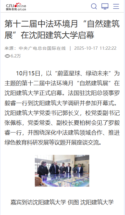 编者按:10月15日,以“蔚蓝星球、绿动未来”为主题的第十二届中法环境月“自然建筑展”在沈阳建筑大学正式启幕。法国驻沈阳总领事罗毅睿一行到沈阳建筑大学调研并参加开幕式。中央广电总台国际在线对此进行了宣传报道。现将相关报道转载如下: