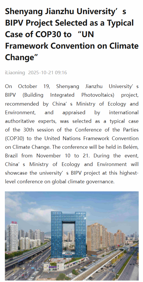 编者按:近日,由生态环境部推荐、权威专家评审,沈阳建筑大学“光伏建筑项目”成功入选《联合国气候变化框架公约》第三十次缔约方大会(COP30)中国角典型案例(全国共十二项入选),将在11月10日至21日于巴西贝伦举行的COP30“中国角”边会上面向全球发布。沈阳建筑大学此次入选的“光伏建筑项目”通过将高效光伏组件与建筑围护结构一体化设计,实现建筑自身产能、节能、美学的多重目标,对我国城乡建设领域“双碳”路径具有显著示范价值。案例的入选,标志着学校在绿色低碳建筑领域的创新实践获得国际认可,也为全球气候治理提供了“中国方案”。辽宁日报国际传播中心对此进行了宣传报道。现将相关报道转载如下: