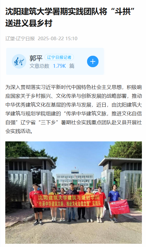 编者按:为深入贯彻落实习近平新时代中国特色社会主义思想,积极响应国家关于乡村振兴、文化传承与创新发展的战略部署,推动中华优秀建筑文化在基层的传承与发展,近日,由沈阳建筑大学建筑与规划学院组建的“传承中华建筑文脉,推进文化自信自强”辽宁省“三下乡”暑期社会实践重点团队赴义县开展社会实践活动,辽望·辽宁日报对此进行了宣传报道。现将相关报道转载如下: