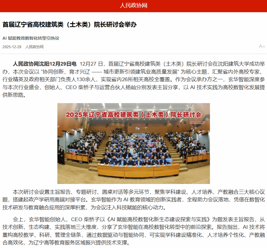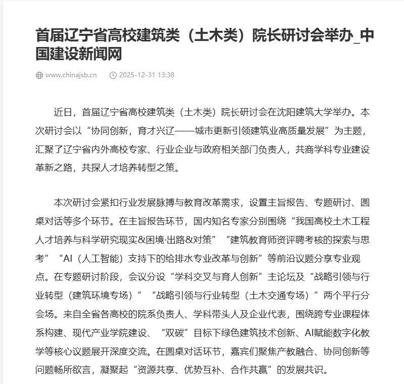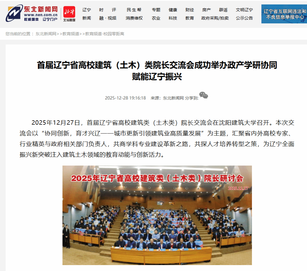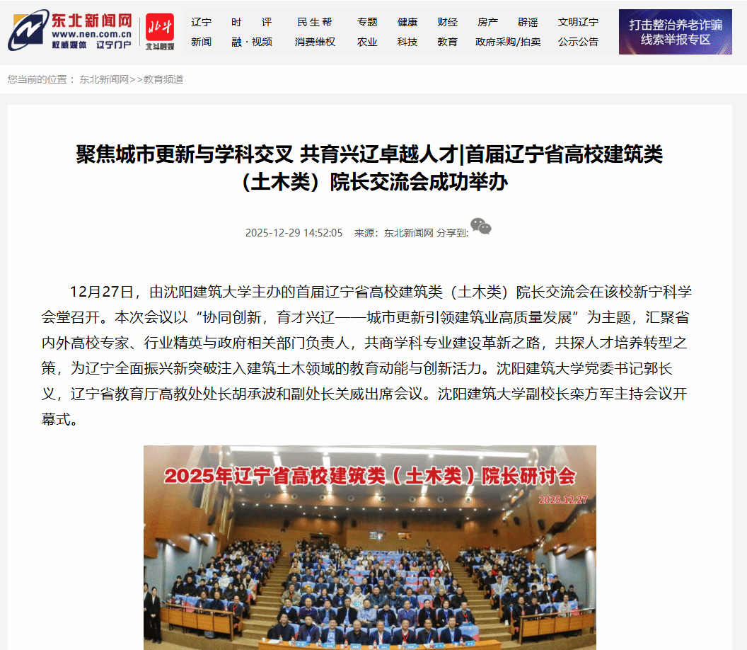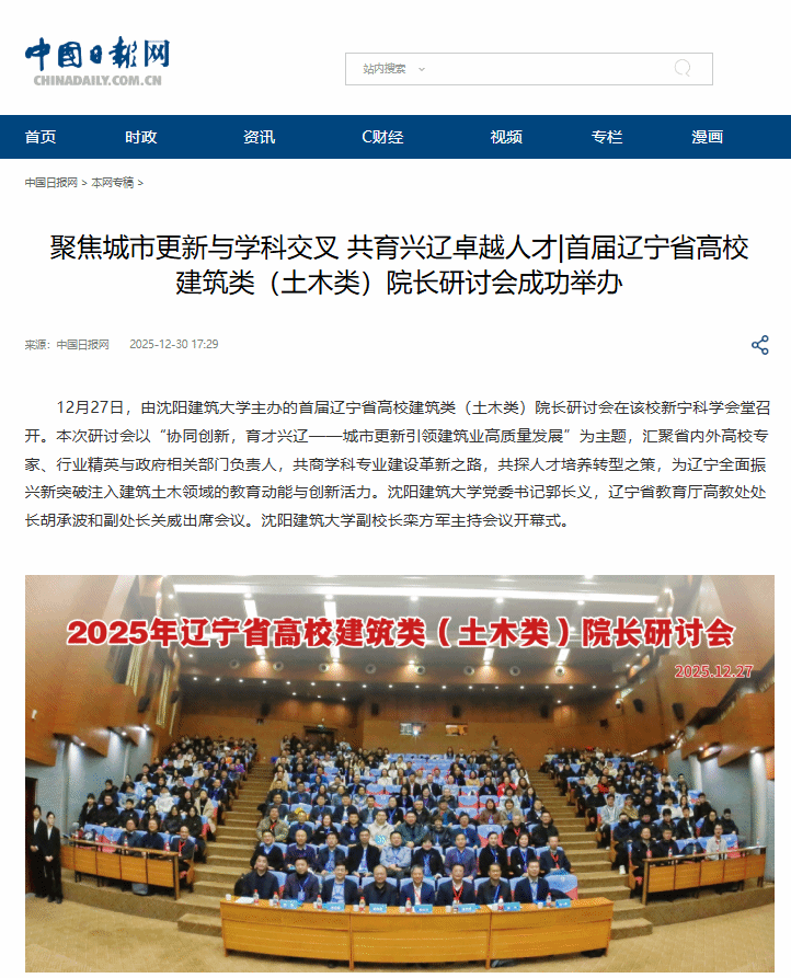 编者按:2025年12月27日,首届辽宁省高校建筑类(土木类)院长研讨会在沈阳建筑大学召开。本次研讨会以“协同创新,育才兴辽——城市更新引领建筑业高质量发展”为主题,汇聚省内外高校专家、行业精英与政府相关部门负责人,共商学科专业建设革新之路,共探人才培养转型之策,为辽宁全面振兴新突破注入建筑土木领域的教育动能与创新活力。中国新闻网、中国日报、中国建设新闻网、人民政协网、东北新闻网对此进行了宣传报道。现将相关报道转载如下: